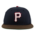 The Pittsburgh Pirates 59FIFTY Fitted hat features an embroidered P at the front panels with a 2006 All-Star Game side patch at the right-wear side. Additional details include a matching color batter man, walnut brown brim and a green under visor.