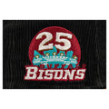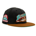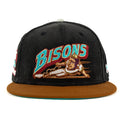 The Buffalo Bison 59FIFTY Fitted hat features an embroidered sliding Bison at the front panels with a 25 year side patch at the right-wear side. Additional details include a matching color batter man, toasted peanut brim and a teal undervisor.