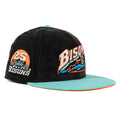 The Buffalo Bison 59FIFTY Fitted hat features an embroidered sliding Bison at the front panels with a 25 year side patch at the right-wear side. Additional details include a matching color batter man, blue tint brim and a hunter flame orange undervisor.