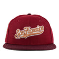 The San Francisco Giants 59FIFTY Fitted hat features an embroidered San Francisco script across the front panels with a 2007 All-Star game side patch at the right-wear side. Additional details include a matching color batter man at the rear, maroon brim and grey under visor.