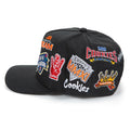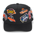 This snapback hat features embroidered patches and fits most head sizes. Made from 100% polyester, it has a flat bill that can be curved, a high crown, and a structured fit for comfortable wear.