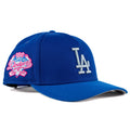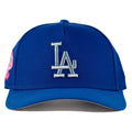 The Los Angeles Dodgers 100 year anniversary side patch 9Forty M-Crown A Frame snapback features an embroidered LA logo at the front panels with a blue visor, and a grey under visor.